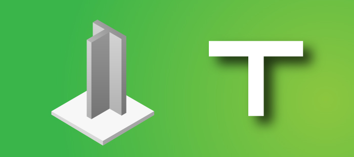 Columnas en forma de T. Conformadas por un soporte central y una sección transversal. Estas columnas ofrecen alta resistencia con un peso reducido, siendo ideales para aplicaciones en puentes y muros prefabricados.